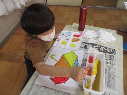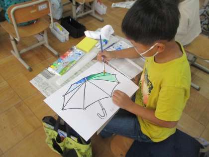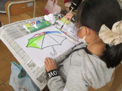 絵の具の使い方について学習しました。筆洗やパレットの使い方,筆使いなどを知り,その後,傘のイラストを丁寧に彩色しました。水を使って少しずつ色を薄くして,色のグラデーションを作りました。子どもたちは,とても楽しそうに色を塗っていました。出来栄えに満足そうにしていました。