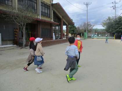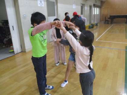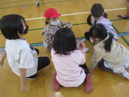 明日は待ちにまった,秋の遠足です。動物園では2年生のお兄さんお姉さんと一緒に,グループでクイズラリーをします。今日は2年生と一緒に体育館や運動場でグループ遊びをし,楽しそうに遊ぶ姿が見られました。明日の遠足も仲良く楽しく,活動できたらいいですね。