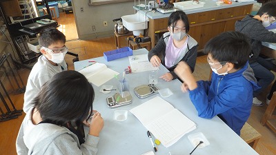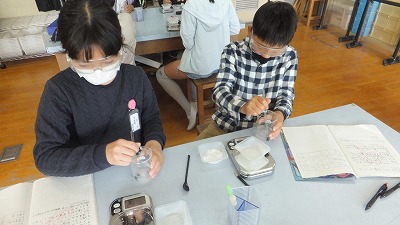 今日はミョウバンが水50mlにどれだけ溶けるか調べました。メスシリンダーや電子てんびんを使って水とミョウバンを正確に測り取りました。食塩は15g溶けましたが,ミョウバンは5gしか溶けませんでした。あまりの違いにびっくりしていました。