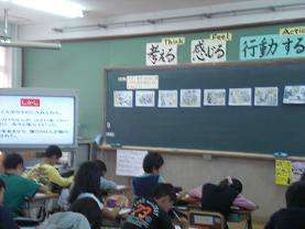 6年社会「江戸の文化と新しい学問」の単元で「渋染一揆」の授業研究に取り組みました。町人が力をつけしだいに武士の支配力が弱まる中で「渋染一揆」がどんな一揆であったかを子どもたちは考え、話し合いました。電子黒板を使っての電子紙芝居とアナログの掲示物を使い分ける工夫も研究しました。