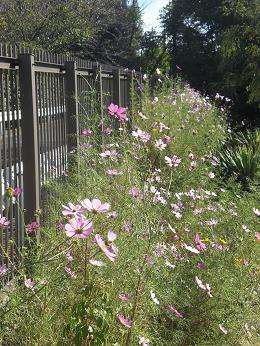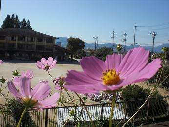 毎年、京都銀行から種をいただいているコスモスが、スロープの垣根に沿って満開になりました。風に揺れるコスモスの花の間から藤城の校舎が見えて・・・とても素敵な風景です。