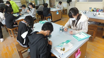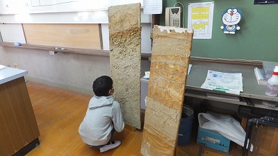 土地がしま模様に見える原因について学習しました。剥ぎ取り標本を見たり,それぞれの層のサンプルを双眼実体顕微鏡で観察したりして調べました。「粒の大きさが違う。」「色が違う。」「できた時期が違うのかな。」「種類の違う砂や土が積もっているみたい。」などいろいろな意見が出ました。
