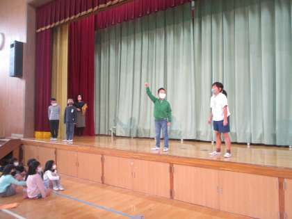 舞台上での練習が始まりました。舞台上での立ち位置や,舞台袖からステージに出てくるときの動きなどを確認しました。がなくんとかえるくんの出てくる3つの話を音読劇でするのですが,どのグループも張り切っています。場面ごとの動き,場面と場面のつなぎの動きをしっかり覚えていきってほしいと思います。