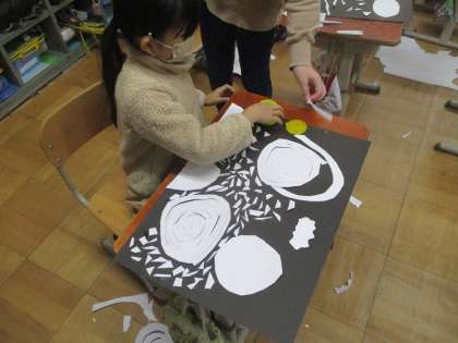 はさみで,白い画用紙を思い思いに切って,黒画用紙の上に置いていろいろと動かして