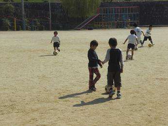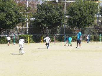 スポーツの秋、さわやかな空気に満ちた青空の下でふれあいサッカー教室が開かれています。3連休の初日のせいか、今回はふだんより少ない参加ですが、少数精鋭!の子どもたちが、しっかり汗をながして取り組みました。