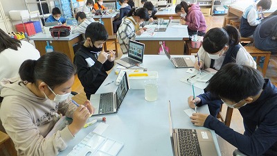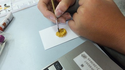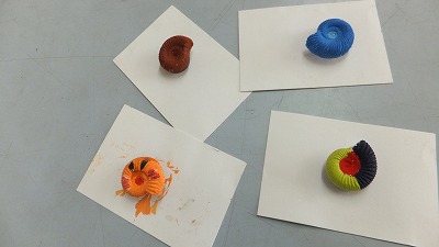 アンモナイトの型に石こうを流し込んでレプリカを作りました。乾いた後,型から外して,色を塗りました。生きていた時の色を想像したり,化石の色を調べたりして色を考えました。