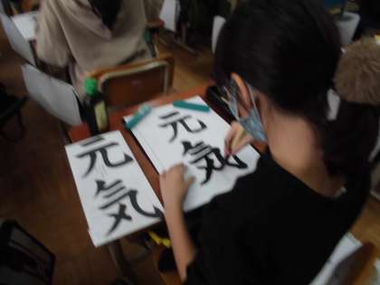 毛筆で「元気」という字を練習しました。