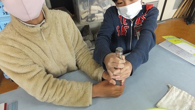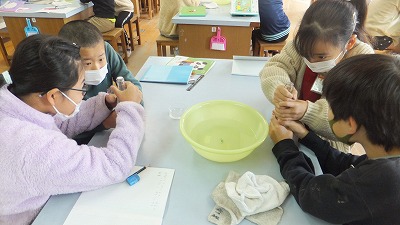 ガラスびんにぬらした1円玉をのせて,びんを両手で握りました。しばらくすると「あれ?1円玉が動いてる!」「5回,パコパコ動いた。」などと子ども達から驚きの声が聞こえてきました。動いた理由を問いかけると「空気が上に動いた。」「空気が押した。」などといろいろな意見が出てきました。次の時間,1円玉が動いた原因を調べようということになりました。