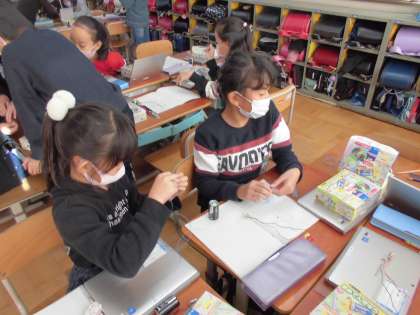 写真は,豆電球をソケットから外した状態では,どうすれば点灯するのか相談しているところです。