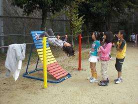 運動場の鉄棒に2台の逆上がり補助具を設置しました。始業式で「逆上がり上達マシーン?」と紹介した練習用の器具です。子どもたちが逆上がりのコツをつかむための優れた補助具で、さっそく「できた!」の歓声があがっていました。「みんなで順番になかよく使いましょう。」と指導もしっかり守れています。