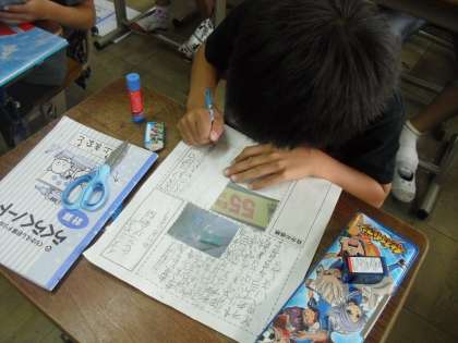 先日社会見学で出かけたイズミヤで、見つけてきた「スーパーマーケットのお客さんを集めるための工夫」についての新聞作りに取り組んでいます。工夫についての記事を二つ、インタビューして分かったことを一つ、そして自分の感想を入れることをめあてにしています。完成したら、お互いに交流をしようと思っています。