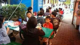 お昼のお弁当タイムになりました。広場のベンチで、園児さんのとなりで、いただきました。みんなで食べると特別に美味しくかんじます!
