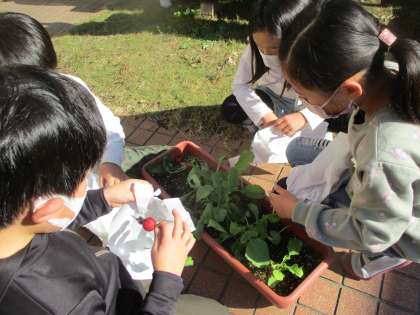 はつか大根を収穫しました。真っ赤な実がおいしそうに育ちましたね。