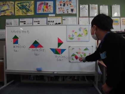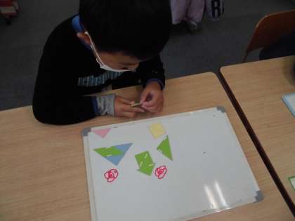 色板をつかって,「家」や「船」などいろいろな形を作りました。