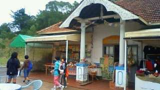 弱い雨がふりだしましたが、傘をささなくても動けます。子どもたちは、各国の建物を見学しながら、おみやげ選びを楽しんでいます。