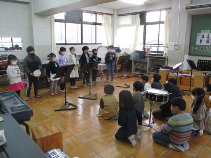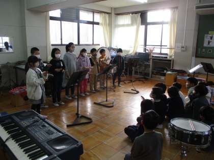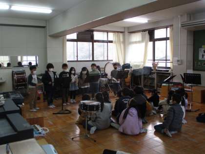 今日は,「かぼちゃ」の発表会をしました。リズムを合わせてどのグループも上手に演奏することができました。特に,だんだん大きくするところや,最後にしっかりと消音をするところがよかったです。よく頑張りましたね。
