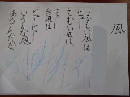 見たことや聞いたこと,思ったことを詩に表しました。様子をあらわす言葉を使うことをめあてにしました。子どもたちが選んだテーマは,節分,クリスマス,お誕生日,お年玉,雪合戦など,最近の行事に関わることが多かったです。どの子も自分が感じたことを短い言葉や音の響きを表す言葉,たとえを使って作っていました。