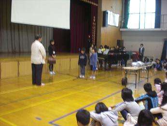 本日の集会の後に、六地蔵のイズミヤさんからいただいた図書室の本の贈呈式を行いました。イズミヤさんには毎年、4年生が社会科の見学でお世話になっています。そのときにも学んできた「エコ」の取組の一つ、エコバッグを持参してもらいレジバッグは有料というシステムの収益金を、小学校図書の充実にあてて寄付してくださったのです。図書委員会がお礼の言葉を述べ、本を紹介して全校で「ありがとうございます」と