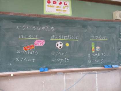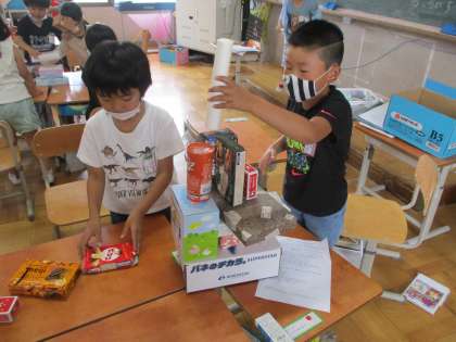算数の時間に,お家から持ってきたおかしの箱や缶の形を見てなかまわけをしました。「はこのチーム」「ボールのチーム」「つつのチーム」3つのチームに分けることができました。「はこのチームとつつのチームは積み上げることができるよ!」「ボールのチームはころがすことしかできないなぁ」と,箱の形の特徴を見つけることができました。授業の最後には,「はことつつチームを高く積み上げよう!」と,はこの向きに注意しながら,高く積上げ楽しんでいました。