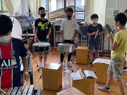 4つのグループに分かれ担当の楽器を決めて,それぞれの楽器を使って練習をしています。