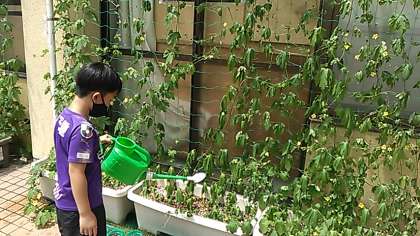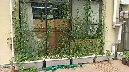 ツルレイシがぐんぐん成長し、緑のカーテンのようになっています。