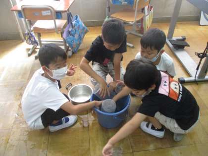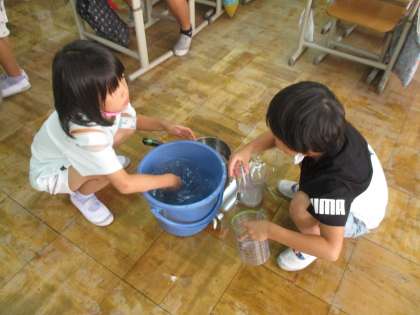 かさの学習をしています。今日は、いろいろな容器を使って、どのくらいの水が入るか「かさ調べ」をしました。1Lますをもとに、どのくらい水が入るかを予想してから調べました。