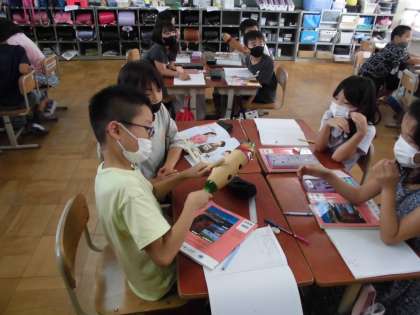理科の「音のふしぎ」の学習で、音が出ている時物はどのようになっているか調べました。じっくり見ると、音が出る時物は震えていることが分かりました。
