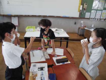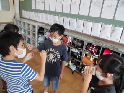 理科の「音のふしぎ」の学習で、糸電話で話しているときは物が震えてるか実験をしました。糸を触った子たちは「ブルブルふるえている。」とびっくりしていました。