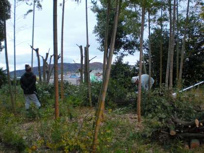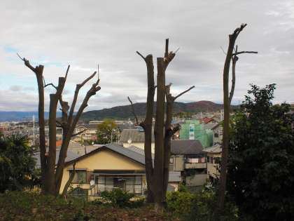 近隣のお宅が日陰になるため,第2グラウンドの北側にある樫の木を業者に剪定してもらいました。竹やぶ越しに京都市内の様子がはっきりと見えるようになりました。