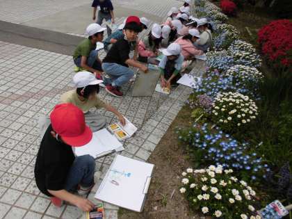 図工で「おはなみスケッチ」を学習しました。春の花や生き物を見て絵に表しました。パンジーやツツジの花、飛んでいるハチを描いて、春を感じながらのびのび描いていました。