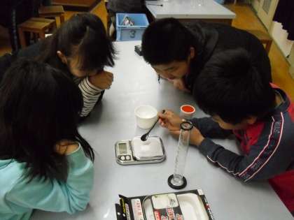 「ものが水にとけるのはどういうことなのか」を調べるために実験をしています。