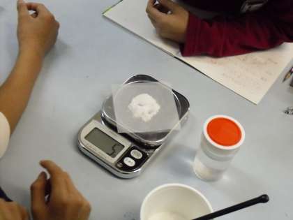 予想を立てて、実験をしました。結果は、とかす前ととかした後の重さが変わらない。「見えなくても食塩は水の中にある」ことがわかりました。