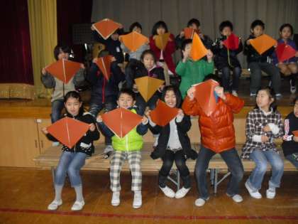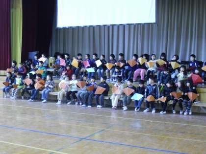 今日は小道具のカードを使って見せ方をメインに練習しました。昨日や一昨日に自分たちで作りました。セリフや歌も覚えられており、あとは声をそろえるところや動きの練習になっていきそうです。