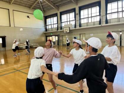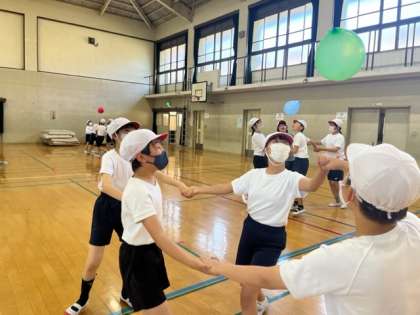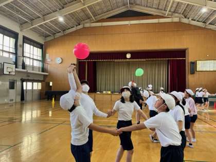体育館の端から端まで、風船を落とさず移動できるよう、体の使い方を工夫しました。