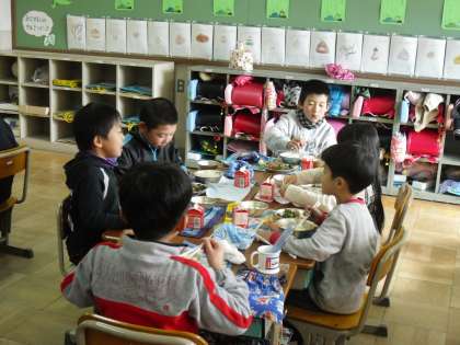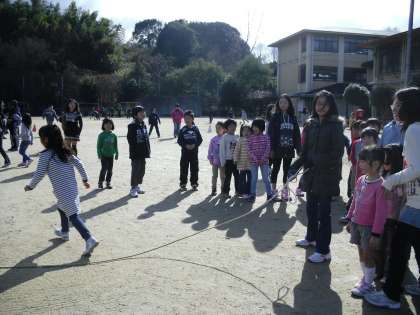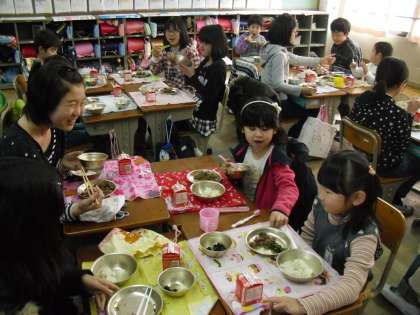 今日は1年生と6年生とで,交流給食がありました。6年生がいて,最初はドキドキしていましたが,前に読み聞かせをしてもらったことがあるので,すぐに仲良くなり,会話を楽しみながら給食を食べていました。大なわ集会では,同じグループにもなるので,昼休みは,一緒に大なわの練習をしました。お兄さん・お姉さんに教えてもらって,みんなニコニコしていました。