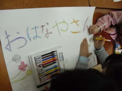 商品をかいたカードやちらし、看板を用意したり、呼び込みの仕方を考えたりして準備を進めています。26日(木)には、いよいよおみせやさんごっこをするので、楽しみです。