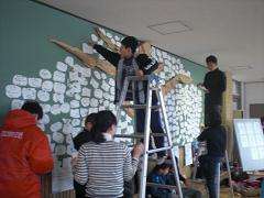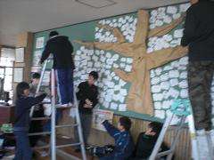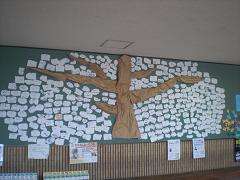 情報委員会がなかまの木の葉っぱを冬バージョンに張り替えてくれました。全校の一人一人が「好きなどうぶつ」についてコメントを書いています。昇降口でみんなを見守るなかまの木は、雪で白くなった葉っぱで冬の模様がえをしました。