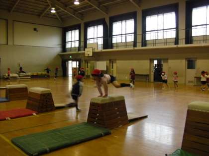 体育でとびばこの学習をしています。はじめは低いとびばこしか跳べなかったけど,だんだん高いとびばこも跳べるようになってきました。