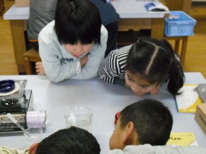 理科ではものの溶け方の学習をしています。とかしたホウ酸は,どこへいってしまったのかな?水溶液を蒸発させたり,冷やしたりして確かめました。