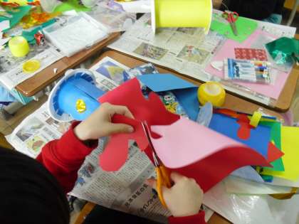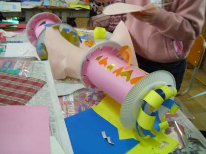 先週の図工の時間は、コロコロゆらゆらの仕組を作ったので、今日は、まわりに飾りをつけました。