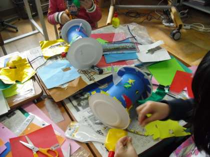 「ぼくは、宇宙のコロコロにしよう!」 「わたしは、海のゆらゆらにしよう!」などと話しながら、楽しく作っていました。