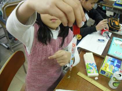 磁石の学習の1回目は「じしゃくにはどんなものがつくだろう?」というめあてで実験をしました。前回の豆電球の時のように「つくもの」「つかないもの」を予想してから実験をしました。子ども達は「金ぞく」はじしゃくにつくと自信満々で予想していました。でも実際に試してみて、びっくり!!「10円玉」も「1円玉」もつかないということがわかったからです。豆電球の時とはちょっと違うようだということに気づいた1時間でした。