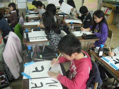 3年生は久しぶりに習字をしました。今回は初めてのカタカナ「ビル」に挑戦です。ここでは曲がりと点に注目して学習しました。まだまだ慣れないものの、一画一画丁寧に書いていました。