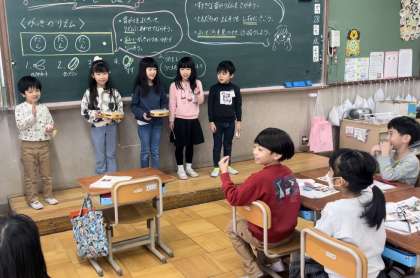 音楽科の学習では、小型楽器を使って音探しを楽しみました。それぞれがお気に入りの音を見つけて、その良さについて伝え合う音ができました。また、単元の最後には音楽発表会を行いました。オリジナルのリズムや、グループで息を合わせたリズムを発表することができました。友達の良いところ探しをしながら、明るい雰囲気で楽しむことができました。