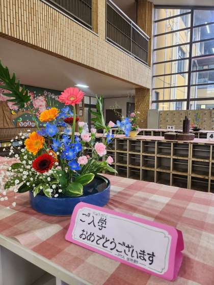 昇降口、4月の生け花。