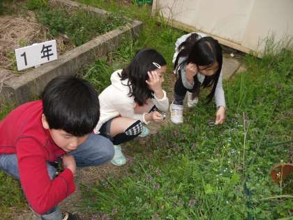 藤城小学校の第二グラウンドには,春に咲く植物がたくさん咲いていました。3年生は虫眼鏡を使ってくわしく観察して,気づいたことを記録しました。「花粉がついている」「毛がはえてるみたいや」等のつぶやきがありました。