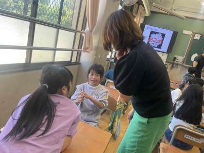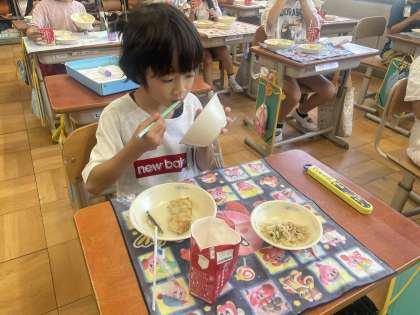 栄養教諭の方に講師に来てもらい、正しいごはんの食べ方について学習しました。お米にはお米の殿様がいることや、最後の一粒まで残さず食べることの大切さを知りました。給食では、学習したことを意識しながら残さずきれいに食べることができていました。