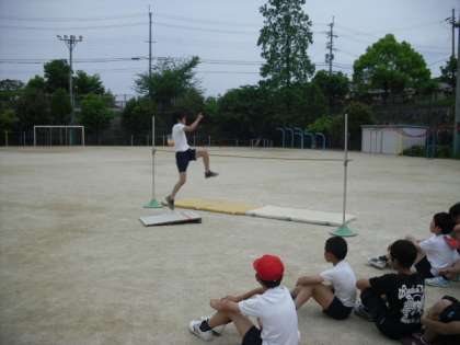 体育では,民謡の学習と並行して,走り高跳びの学習をしています。グループで協力して場づくりをし,安全に気をつけて学習をしていきます。