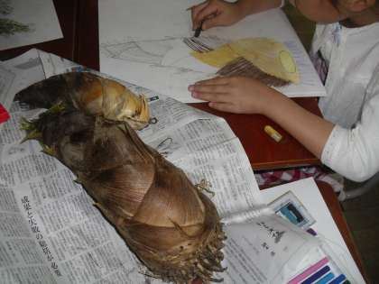本物のたけのこを目の前に置いて,まずは触ったり,においを嗅いだり・・・・・。皮のつき方に驚いたり,新鮮な香りに感動したり・・・・・。そして,次にえんぴつやスケッチペンでスケッチしました。なかなかの出来栄えです。