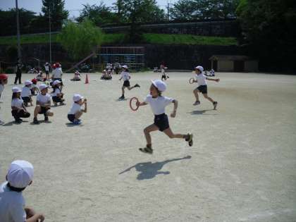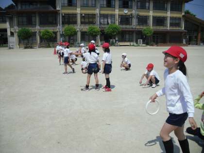 今日は、クラスを5チームにわけて,チーム対抗リレーをしました。